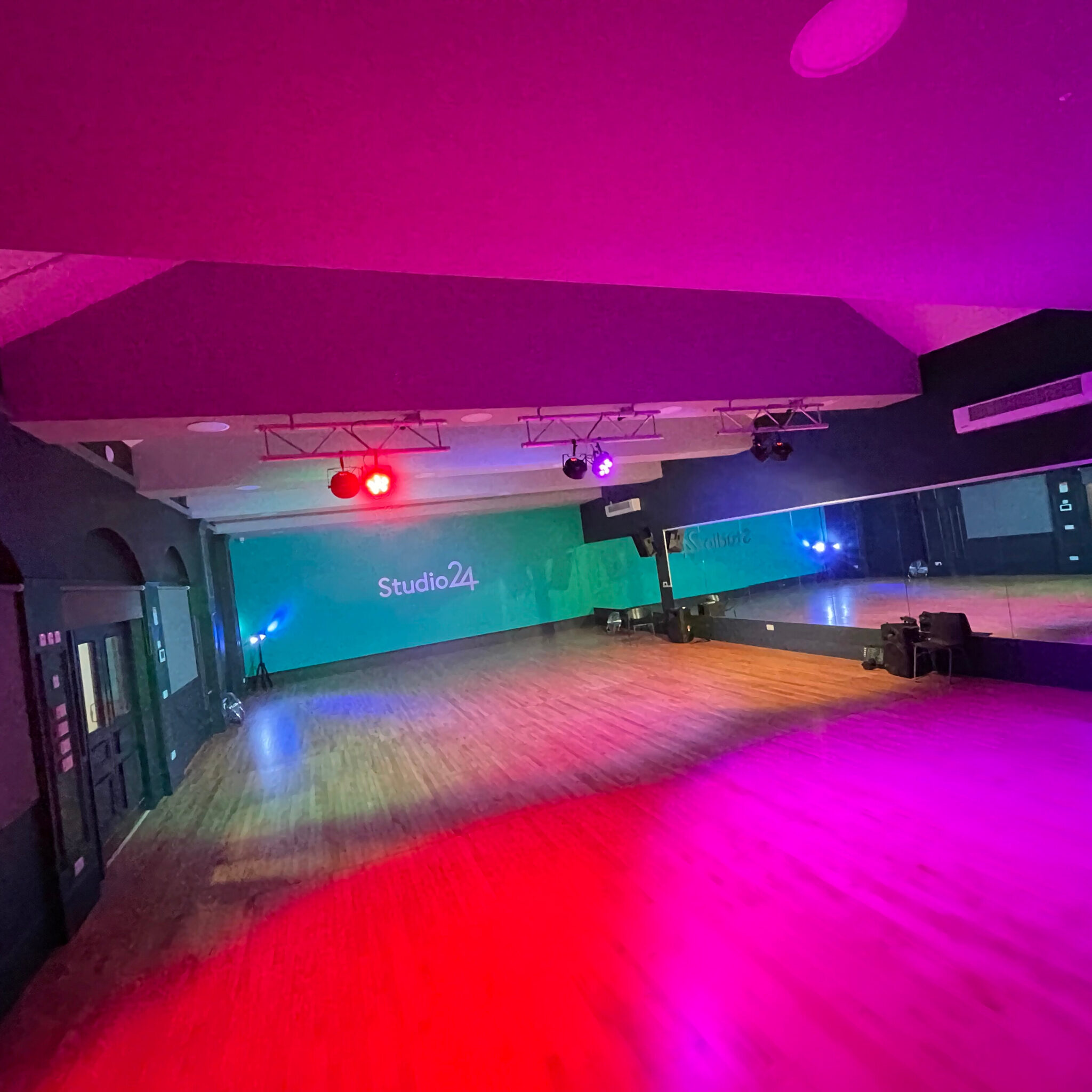 Studio 1 – approx 1600sqft, wooden floor, full length mirrored wall. disco lights.